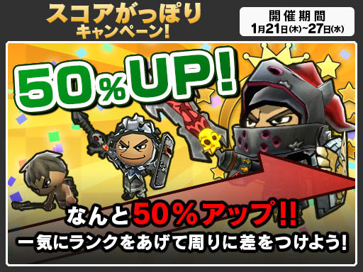 スコアを稼ぐとキャラクターをランクアップできますよ。50%なのでいつもよりグングンと成長しやすく、始めたばかりの方でもすぐに強くなれます。