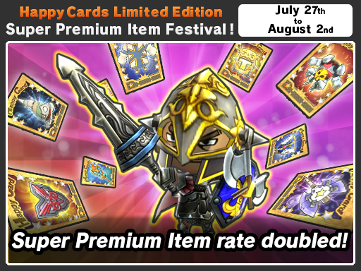 The probability of obtaining a Super Premium Item is normally 100% during Happy Time, and 7% outside of Happy Time. However, during this campaign, the chance of getting a Super Premium Item outside of Happy Time is increased to 14%!